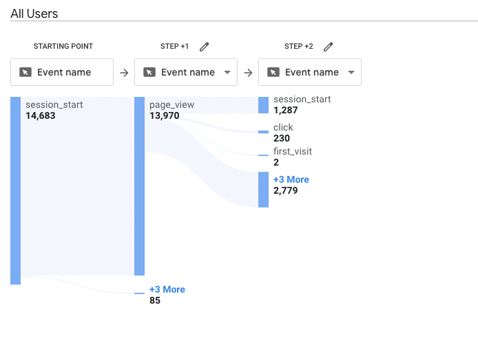 - Informes de recorrido: los flujos de comportamiento y de eventos se han fusionado en esta función, lo que le ofrece una clara representación visual del recorrido del cliente hasta completar una acción.Junto con la capacidad de entrar en detalles minuciosos, GA4 va un paso más allá y muestra este recorrido de atrás hacia adelante, puedes ver todos los pasos que un usuario de la web siguió para llegar al evento, desde el evento. Esto es inmensamente útil para entender el rendimiento y trabajar en las vías más eficaces hacia el éxito.